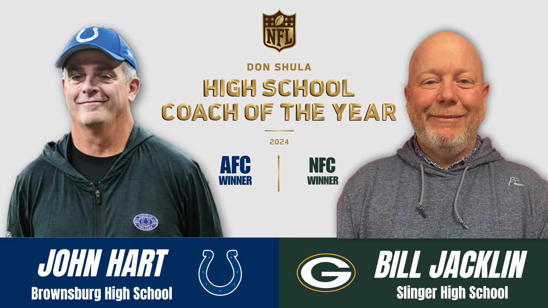 Brownsburg High School coach John Hart and Slinger High School coach Bill Jacklin are the AFC and NFC recipients of the 2024 NFL Don Shula High School Coach of the Year Award.